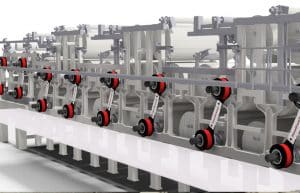 Insgesamt 16 FlexoDirect® Motore kommen nun in der VTG der KM3 zum Einsatz. Die freien Zylinder, die nicht unmittelbar angetrieben sind, werden über das Sieb geschleppt. Die Umschlingung des Siebes an jedem Zylinder wurde durch AS Drives ebenfalls geprüft.